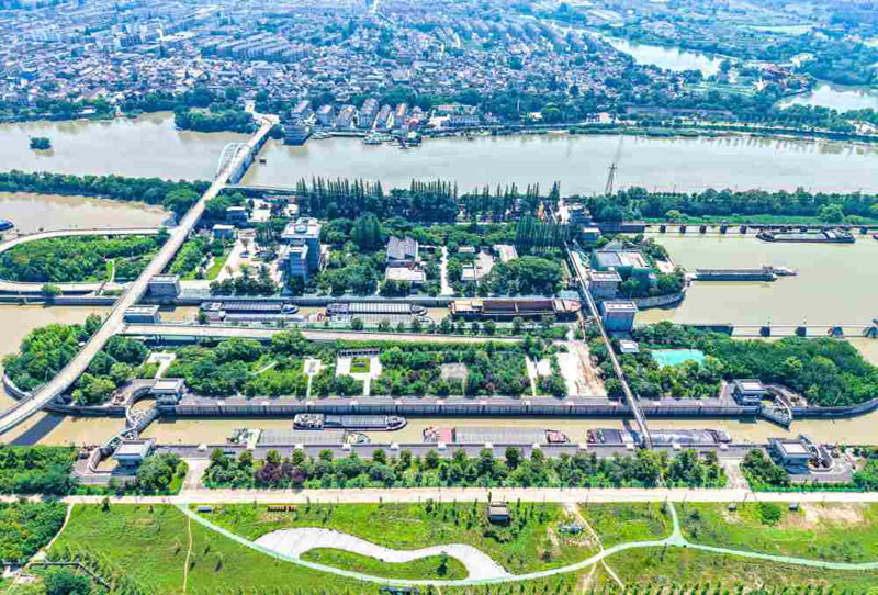 2025年7月4日,船舶有序通过京杭大运河扬州段邵伯船闸(无人机照片)。党的十九届五中全会后初次处所调查,习总来到这里察看长江岸线生态,随后到扬州看大运河沿线整治,“生态优先、绿色成长”从题贯穿此中。