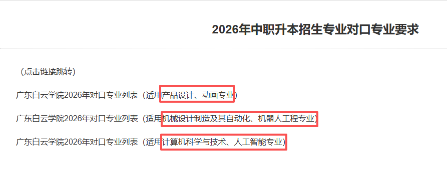 广东白云学院正在学校官网发布了2026年中职升本招生专业对口专业要求,别离是产物设想、动画、机械设想制制及其从动化、机械人工程、人工智能专业,本年没有新增专业。