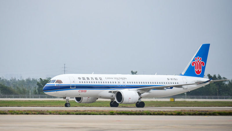 2024年12月11日,由C919执飞的中国南航CZ6786航班正在海口美兰国际机场下降,国产大飞机C919正在海南的贸易飞翔“首秀”成功完成。(记者 杨冠宇/摄)。