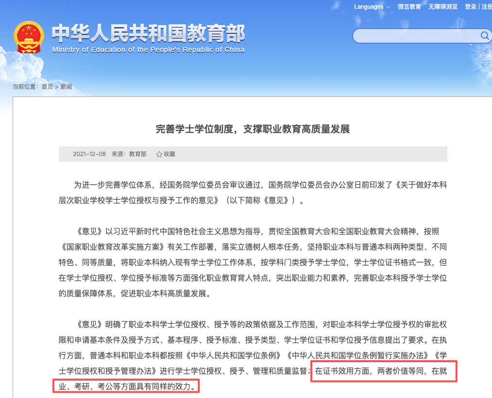 但早正在2021年,教育部发布的相关文件中就曾经提到:正在证书效用方面,职业本科和通俗本科两者价值等同,正在就业、考研、考公等方面具有同样的效力。
